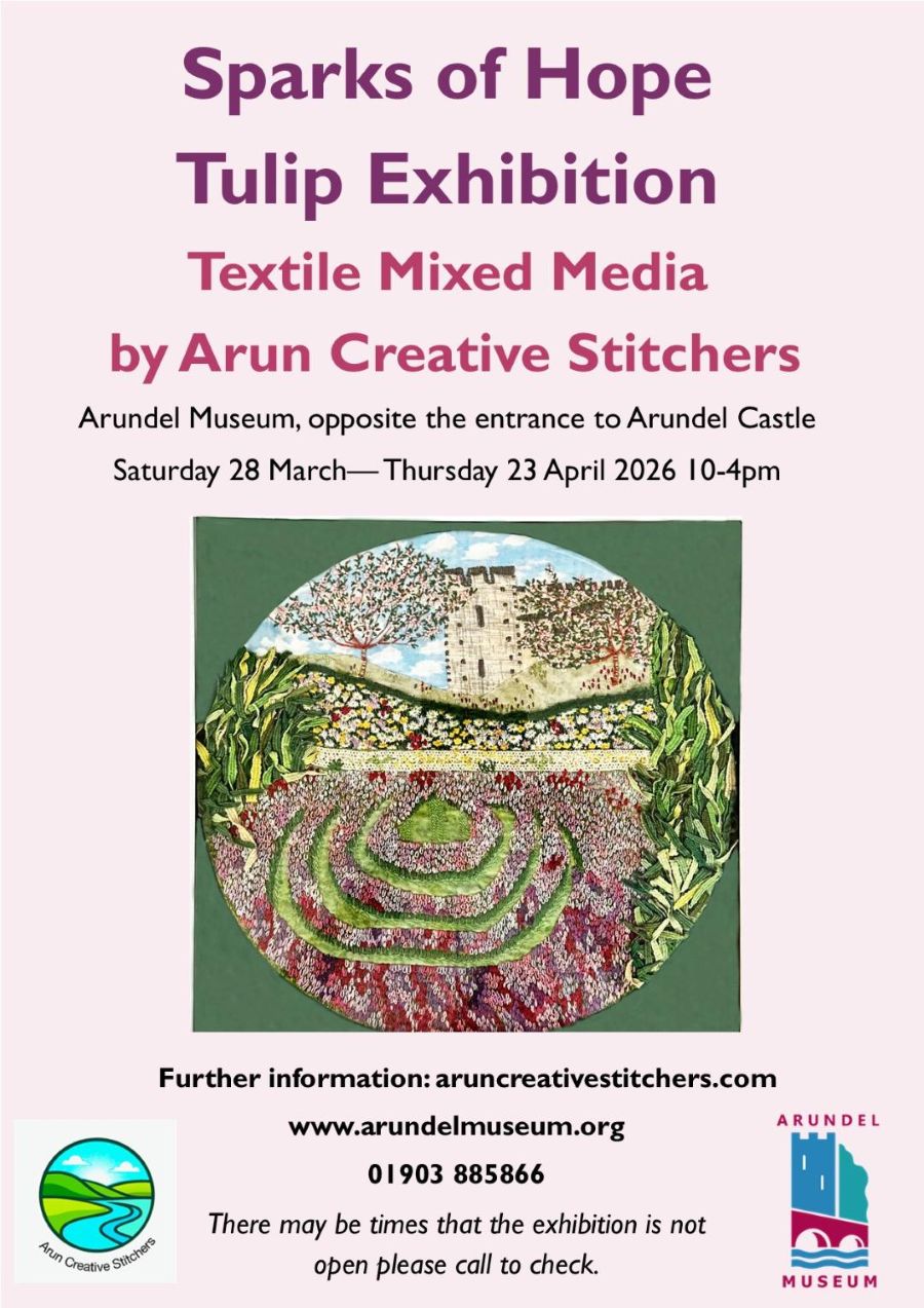Arun Creative Stitchers are holding an exhibition from Sat 28th March to Thurs 23rd April, at Arundel Museum. SCS members Jan and June are members of Arun Creative Stitchers, and are taking part. Details in the attached poster.