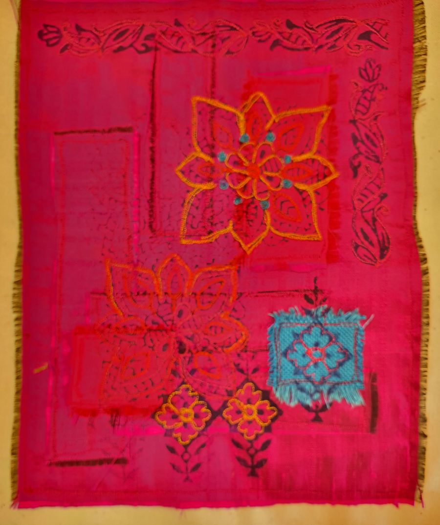 Local artist Wendy Dolan led this workshop for our group this month. Inspired by her travels in India, she demonstrated how to make a collage of brightly coloured fabrics, add decoration with Indian print-blocks, and then embellish with machine and hand-stitching. The final touches will be beads, shisha mirrors, braids etc. Scroll down to see the pieces that were started during the day. They will have lots more added to them over time, so it would be good to see some finished ones later on.