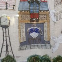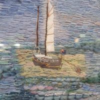 Cobi Erskine described how the group decided which buildings and landmarks to include, and then drew up designs which were given to individual members to stitch before being incorporated into Viviane’s overall design. There were three panels: one that showed the surrounding countryside, one that showed landmarks of Worthing, and one that showed the sea and the beach.