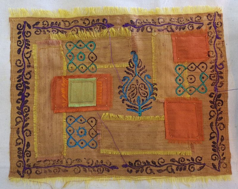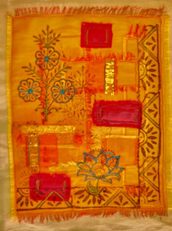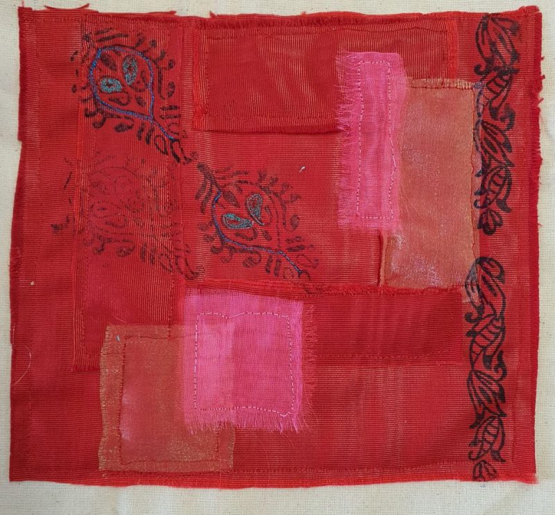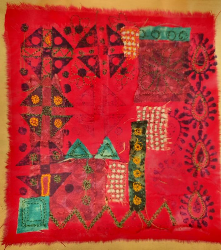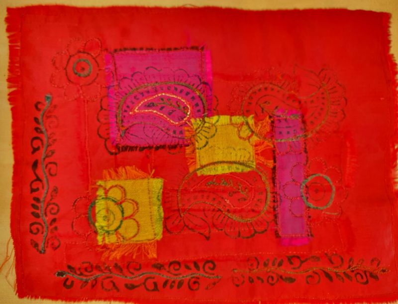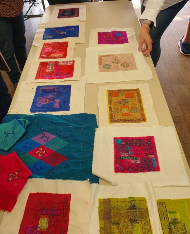 Local artist Wendy Dolan led this workshop for our group this month. Inspired by her travels in India, she demonstrated how to make a collage of brightly coloured fabrics, add decoration with Indian print-blocks, and then embellish with machine and hand-stitching. The final touches will be beads, shisha mirrors, braids etc. Scroll down to see the pieces that were started during the day. They will have lots more added to them over time, so it would be good to see some finished ones later on.