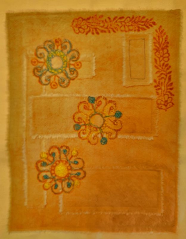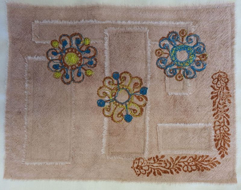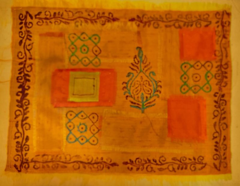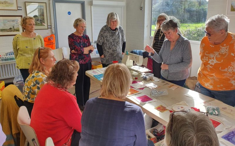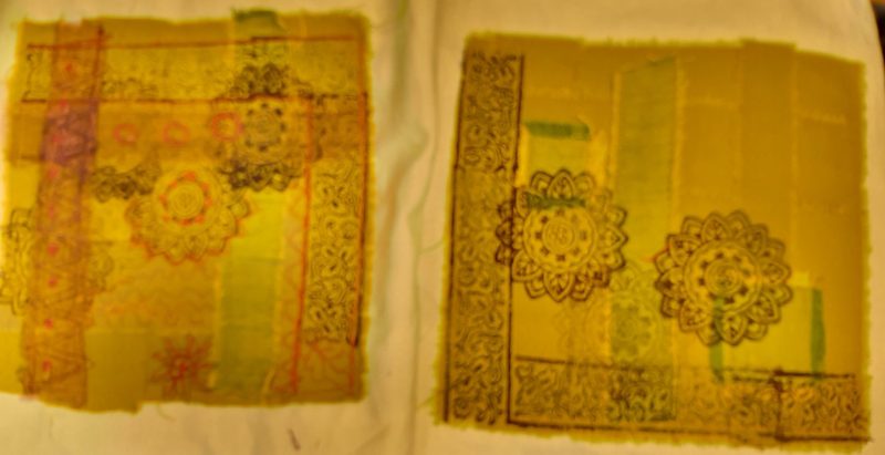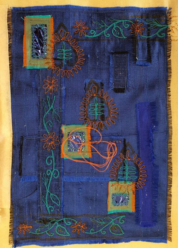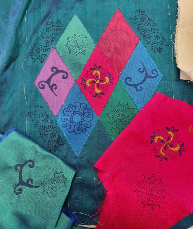 Local artist Wendy Dolan led this workshop for our group this month. Inspired by her travels in India, she demonstrated how to make a collage of brightly coloured fabrics, add decoration with Indian print-blocks, and then embellish with machine and hand-stitching. The final touches will be beads, shisha mirrors, braids etc. Scroll down to see the pieces that were started during the day. They will have lots more added to them over time, so it would be good to see some finished ones later on.